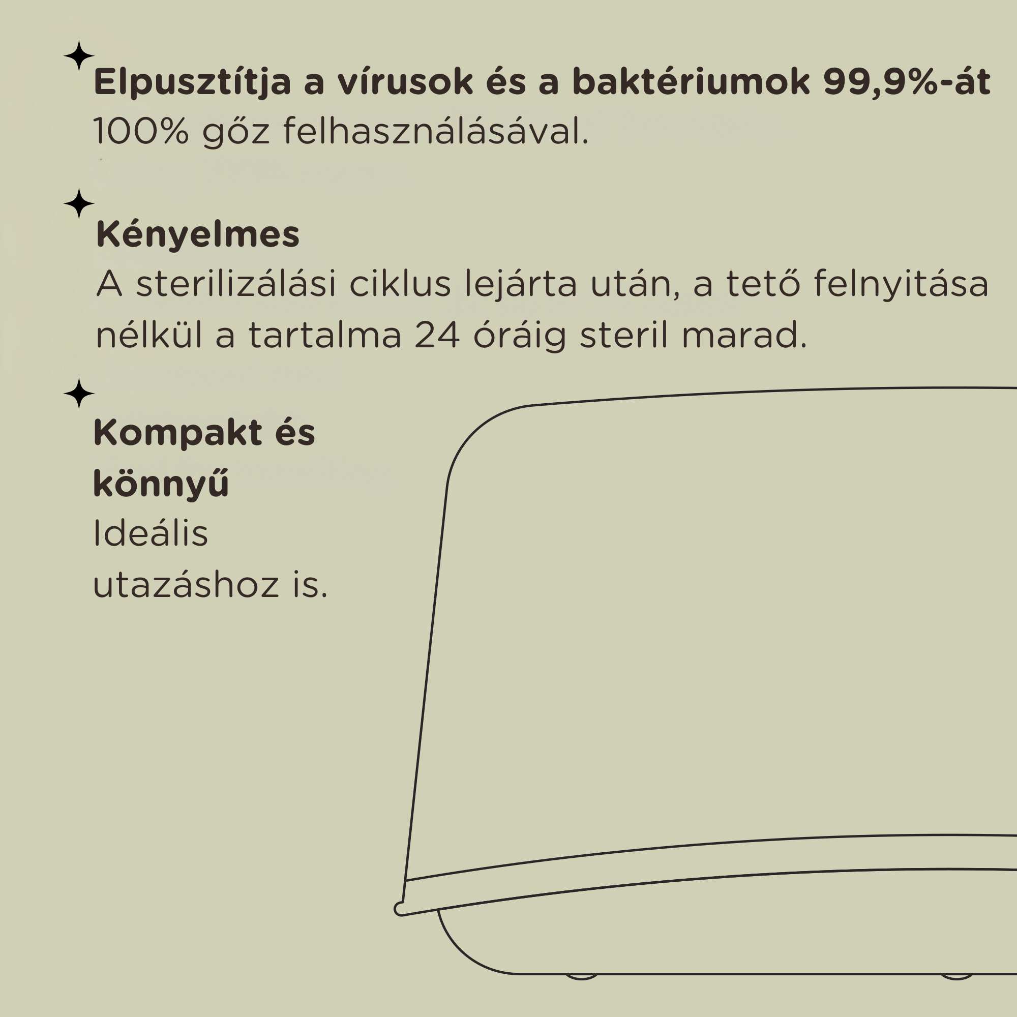 Használata gyors, egyszerű, nincs szükség forralásra vagy egyéb időigényes sterilizálási módszerre. Kompakt mérete miatt akár utazáskor is vihető, és a legtöbb mikrohullámú sütőben kényelmesen elfér.